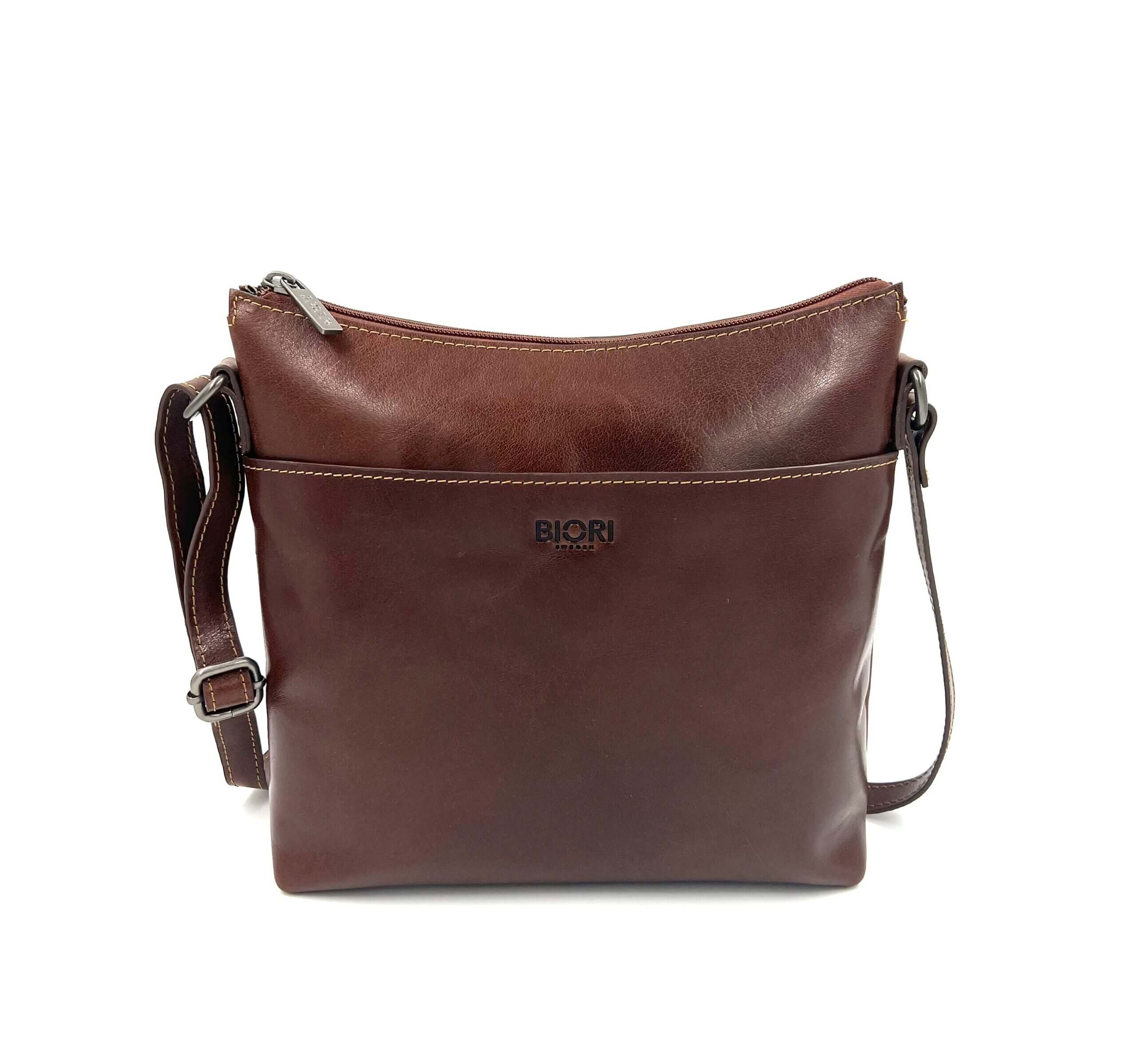 • Handväska i brunt skinn med en dragkedja under klaffen och en justerbar axelrem från Biori Sweden