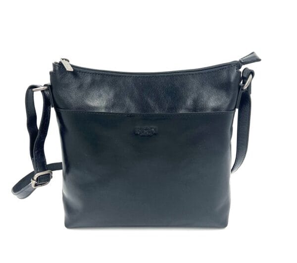 • Svart läderväska med dragkedja upptill och justerbar axelrem