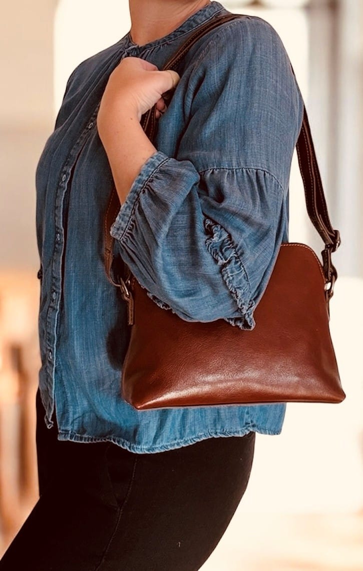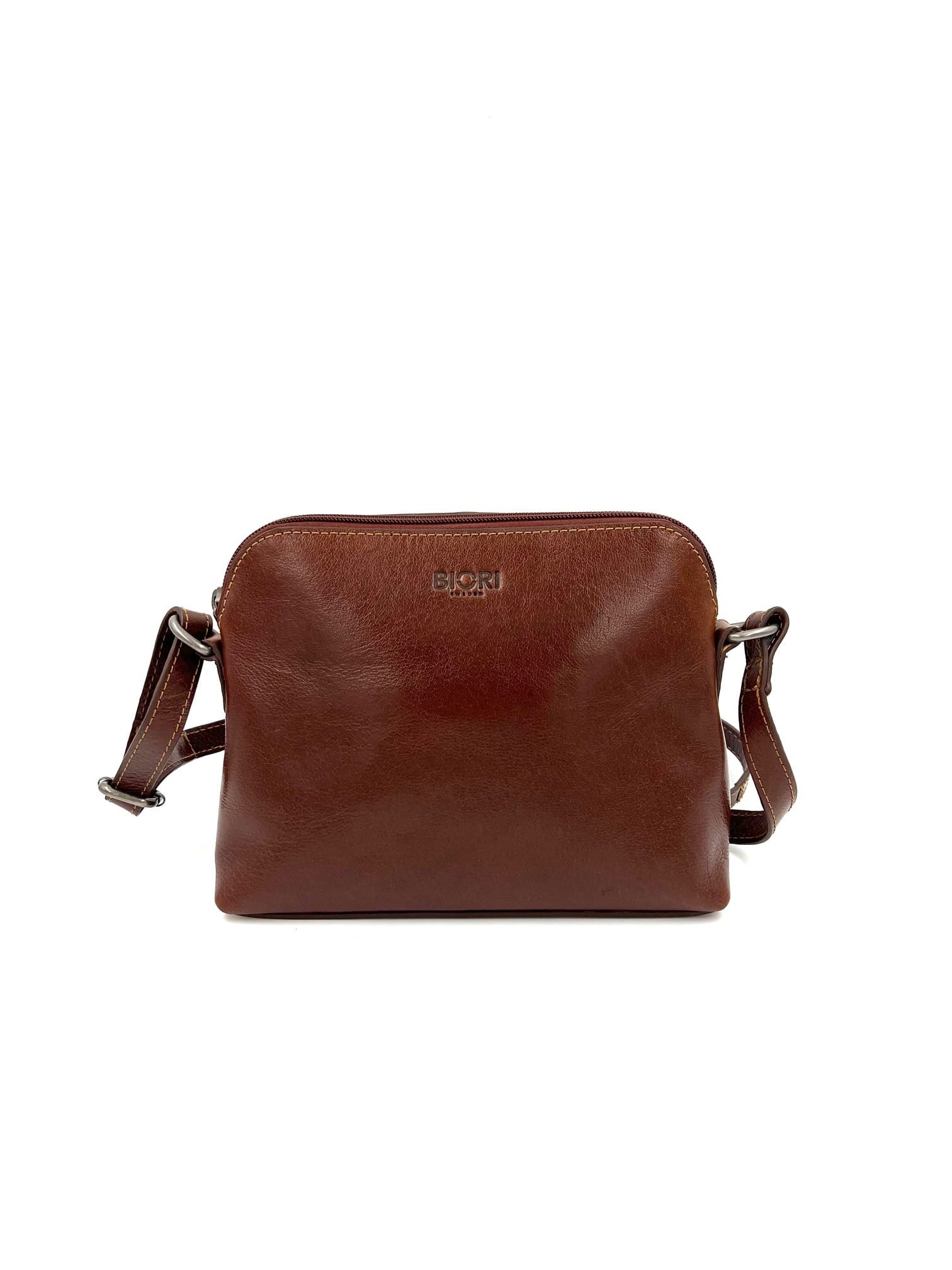 Handväska skinn Biori 5165B i brunt äkta läder är en elegant axelremsväska som passar både vardag och fest. Bär handväskan crossbody eller över axeln tack vare justerbar rem. Tack vare sin smidiga storlek rymmer den mobil, plånbok och nycklar, och blir därför en praktisk vardagsväska. Samtidigt ger den tidlösa designen en stilren look för både jobb och fritid.