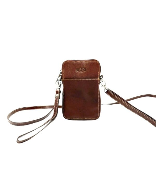 Mobilväska skinn Biori 5169B i äkta brunt läder är en elegant accessoar som förenar tidlös stil med praktisk funktion. Med sin genomtänkta design rymmer den enkelt din mobiltelefon och kan bäras både i handen eller som crossbody tack vare de avtagbara remmarna – perfekt för både vardag och fest.